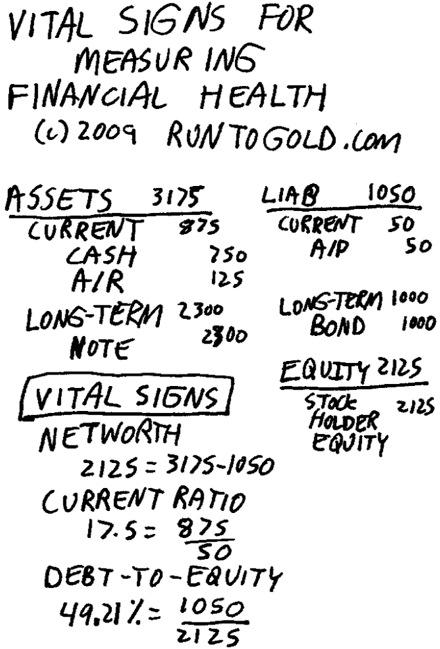 The use of these ratios for financial vital signs will give a quick snapshot of your overall net worth, liquidity and leverage. You can quickly build a spreadsheet using Google Docs and have most of this automatically calculated.